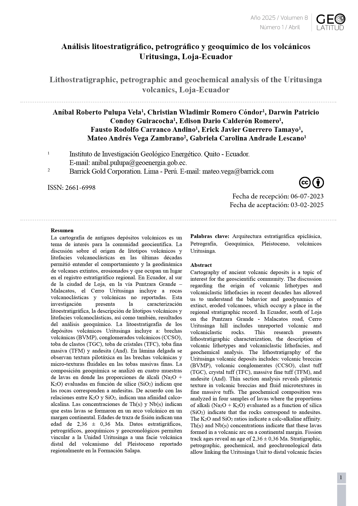En esta ocasión se cuenta con autores de Ecuador. El primer artículo denominado "Análisis litoestratigráfico, petrográfico y geoquímico de los volcánicos Uritusinga, Loja-Ecuador" que hace referencia a la cartografía de antiguos depósitos volcánicos, un tema de interés para la comunidad geocientífica.